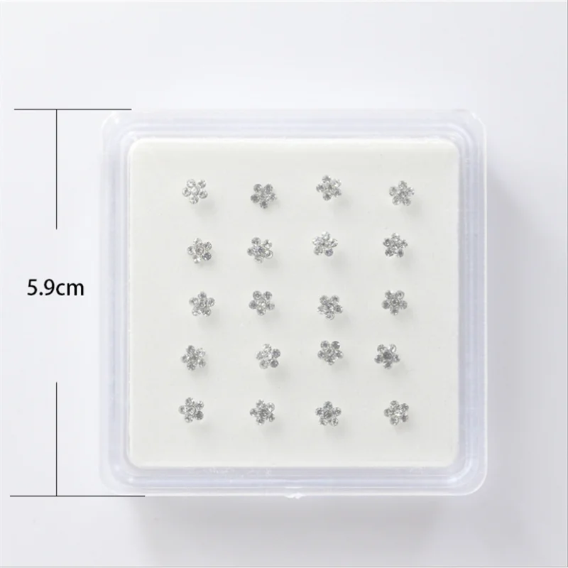 Entdecke unser hochwertiges Set mit 20 wunderschönen Nasenpiercings, perfekt für alle, die ihren Look individuell gestalten möchten. Jeder Nasenstecker ist mit einem farbigen Kristall in Blumenform verziert und sorgt für einen funkelnden, femininen Akzent.